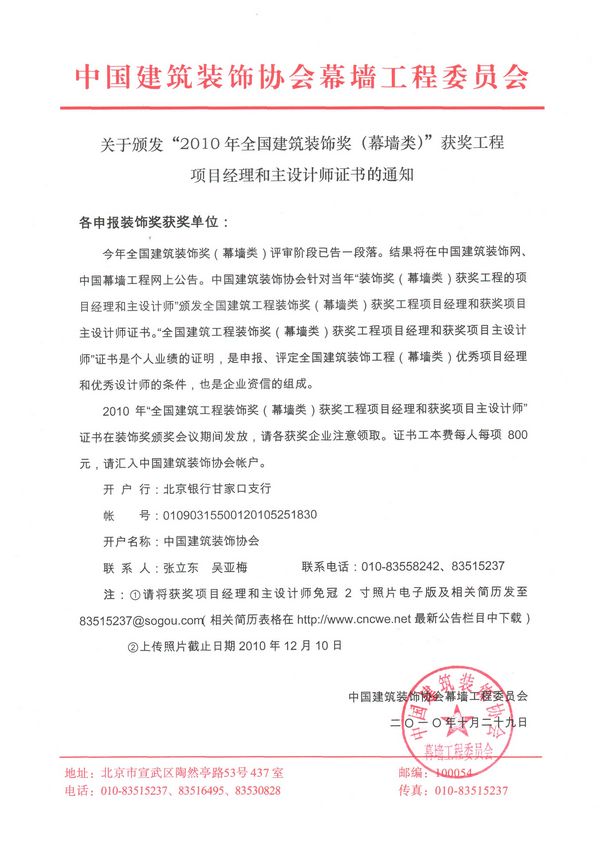 关于颁发“2010年全国建筑装饰奖(幕墙类)”获奖工程项目经理和主设计师的通知
