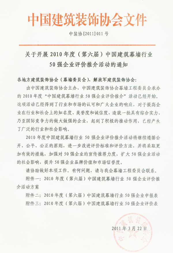 2010年度(第六届)中国建筑幕墙行业50强企业评价推介活动的通知