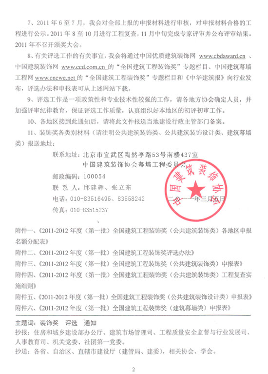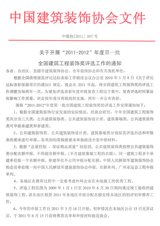 关于开展2011-2012年度第一批全国建筑工程装饰奖评选工作的通知