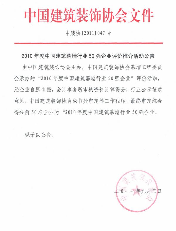 2010年度中国建筑幕墙行业50强企业评价推介活动公告