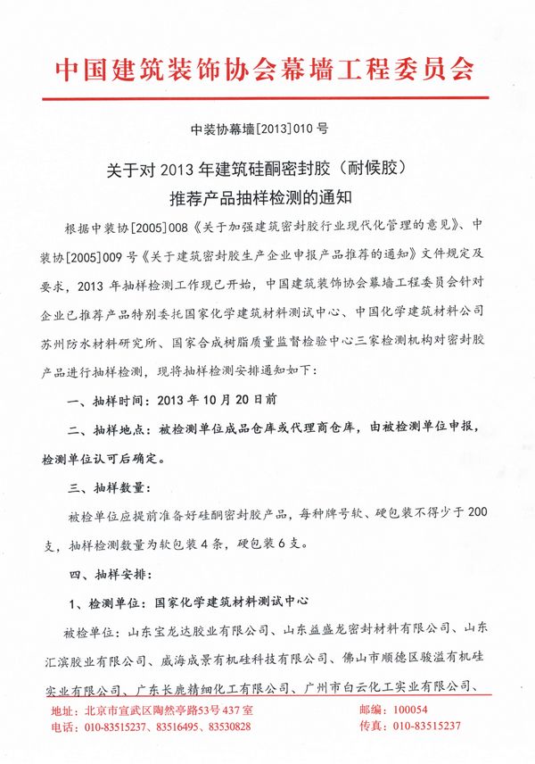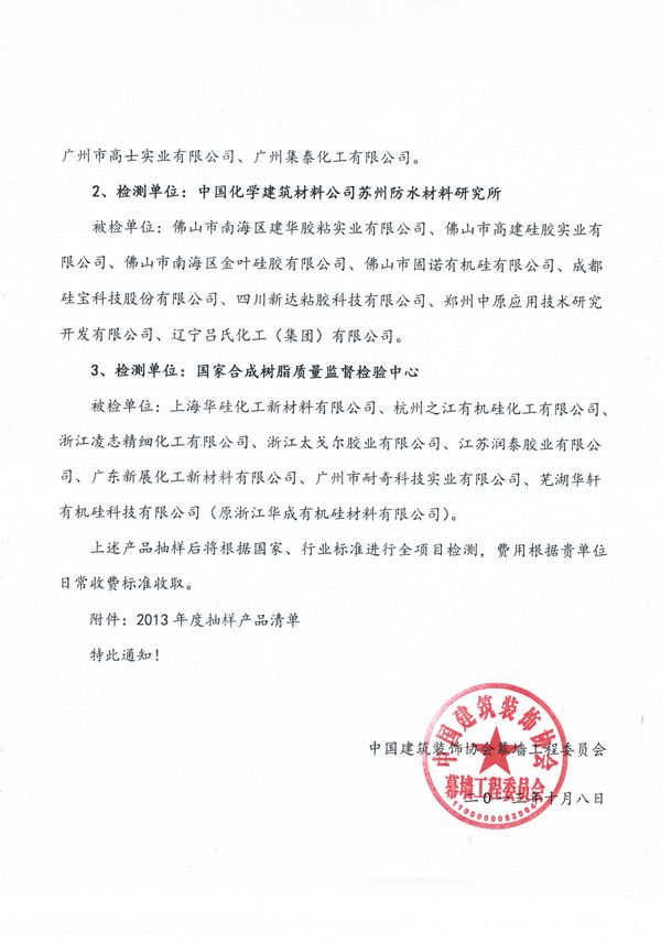 2013年建筑硅酮密封胶(耐候胶)推荐产品抽样检测的通知