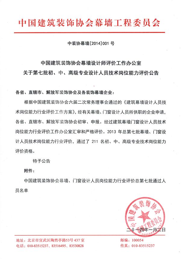 关于第七批幕墙专业设计人员技术岗位能力评价公告