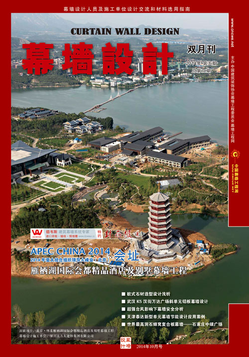 《幕墙设计》2014年十月号于近日出刊。本期的封面报道讲述了雁栖湖国际会都精品酒店及别墅幕墙工程。今年11月,雁栖湖将以“国际会都”的身份迎接APEC二十一个成员国的首脑在此共襄盛举,探讨未来亚太区域合作与发展。与一般会议场所不同,雁栖湖是北京市全力打造的低碳节能项目的典范,“人与自然的和谐”是这里规划理念的主题。本工程包括4#、11#、12#楼的别墅和精品酒店以及展览馆几个部分的幕墙设计和施工单位是深圳市方大建科集团有限公司(中国建筑幕墙50强前十强企业之一)。这几个建筑傍水而建,绿树环绕,山水相互掩映,中国古朴特色与现代科技感的建筑特色相得益彰,俨然一处世外桃源的景色。整个项目的设计都是按照“人与自然和谐”这一主题进行的,采用了节能环保的设计工艺,充分体现了现代建筑的理念与趋势。