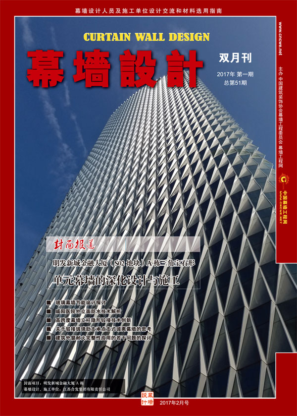 2017年首期《幕墙设计》杂志封面报道以明发新城金融大厦(S02地块)A栋幕墙工程为例,对于三角宝石形异形单元板块这一独特造型的单元幕墙在工程中的应用从板块设计、加工、施工安装等进行了详细的介绍,并对幕墙设计中碰到的难点和关键技术进行了分析。